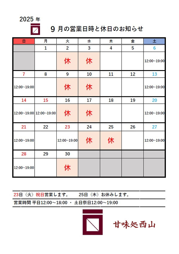 9月の営業日と時間をお知らせします。