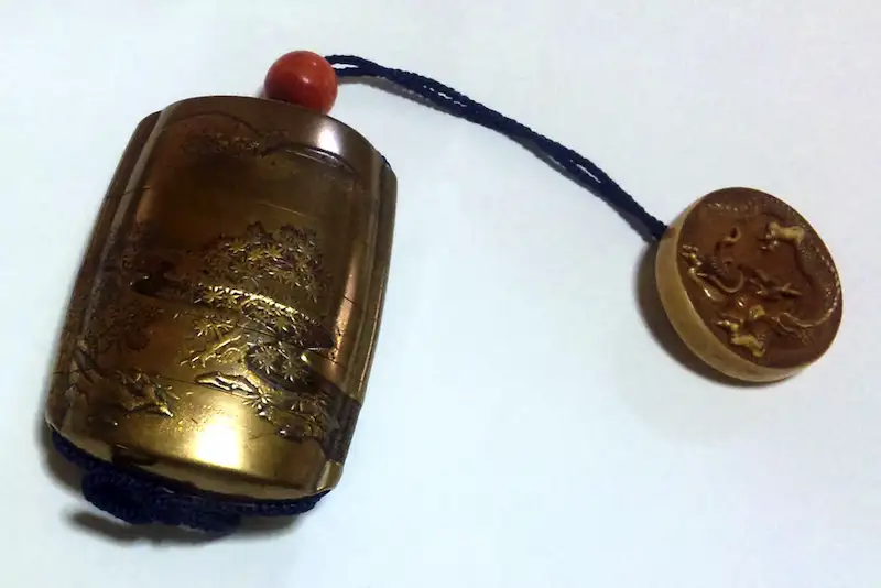 6分割出来る金属製の小物入れです。紐の先に龍の彫刻の根付が付いています。